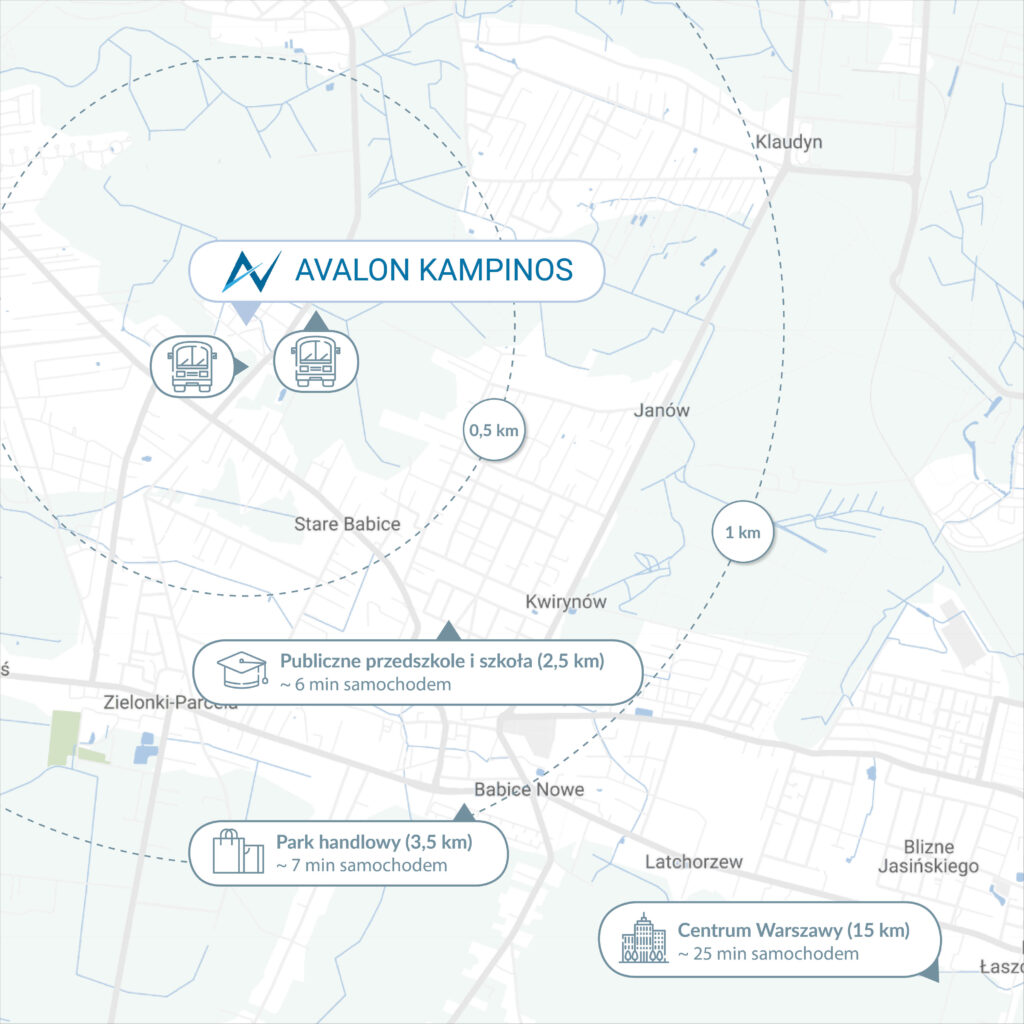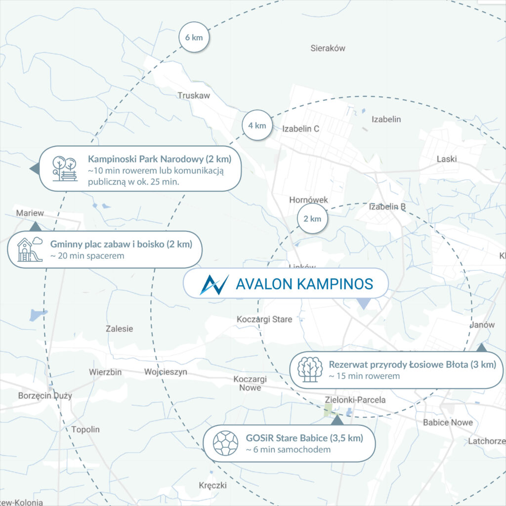 Avalon Kampinos oferuje komfortowy dostęp do całej infrastruktury Warszawy, co czyni ją idealnym miejscem dla osób pracujących w stolicy – znajduje się tylko 5 km od granic miasta. Bliskość ważnych dróg dojazdowych oraz przystanków autobusowych gwarantuje sprawną komunikację z całym regionem. Szybko można dotrzeć do centrum handlowego, licznych sklepów i marketów, punktów usługowych, restauracji, przedszkoli, szkół oraz placówek medycznych. To doskonałe miejsce dla osób, które chcą żyć w spokojnej okolicy, nie rezygnując jednocześnie z udogodnień wielkiego miasta.